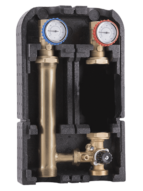 Комплектация: Моноблоки 37D.1 (2 шт.) с кранами, термометрами и обратными клапанами; трехходовой смесительный клапан; патрубок обратной линии; теплоизоляция.