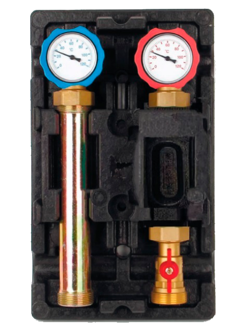 два моноблока на подающей и обратной линии, каждый включает отсекающий шаровый клапан, термометр до 120°C и обратный клапан;