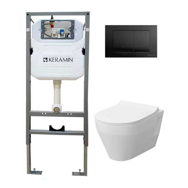 Комплект объединяет надежную инсталляцию, современный безободковый унитаз и стильную черную матовую кнопку смыва — все продумано до мелочей для вашего комфорта.