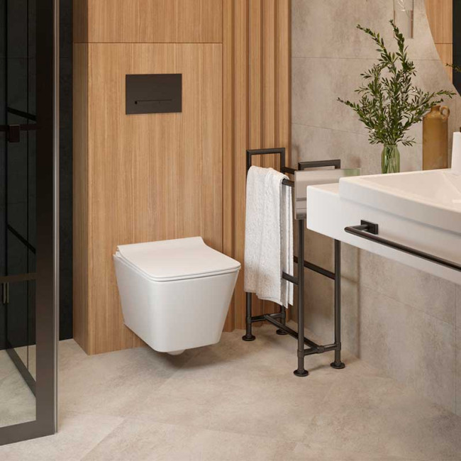 Современный подвесной унитаз с элегантной прямоугольной чашей, который придает интерьеру санузла актуальное звучание и визуальную выразительность.