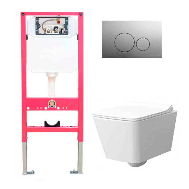 В состав комплекта входят усиленная инсталляция премиум-класса, современный подвесной унитаз с прямоугольной чашей и изысканная круглая кнопка в благородном серебристо-сером цвете.