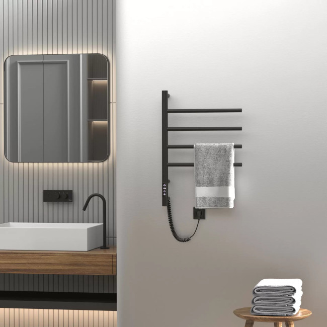 Электрический полотенцесушитель Gloss&Reiter Ti#1 в черном исполнении представляет собой оптимальное решение для помещений с ограниченным пространством. Модель высотой 60 см с четырьмя перекладинами и поворотной конструкцией сочетает в себе элегантный дизайн и практическую функциональность. Компактные габариты делают этот полотенцесушитель идеальным выбором для небольших ванных комнат, санузлов и душевых помещений.